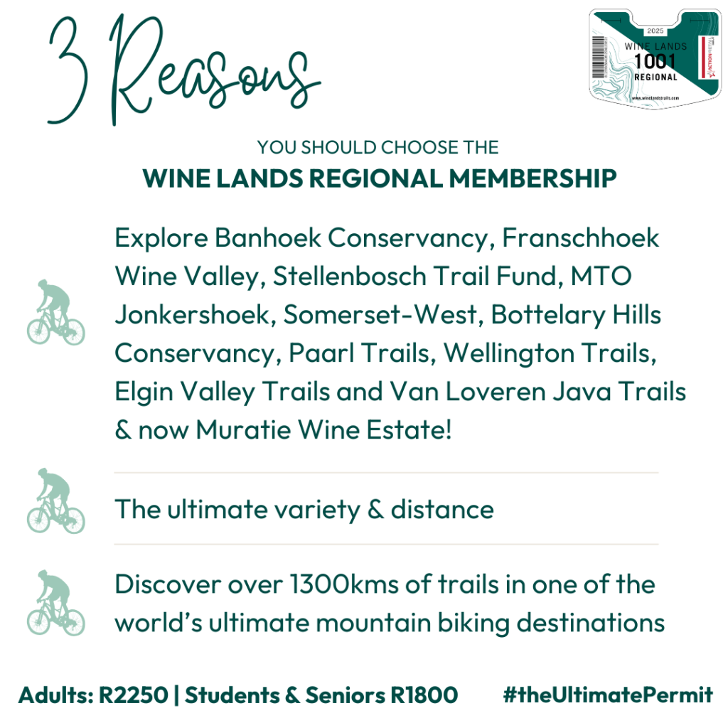 For the ultimate adventure seeker, the regional membership provides access to over 1300 km of interconnected trails, spanning all partner networks. From MTO/Jonkershoek to Elgin Valley Trails and beyond, the possibilities are endless!